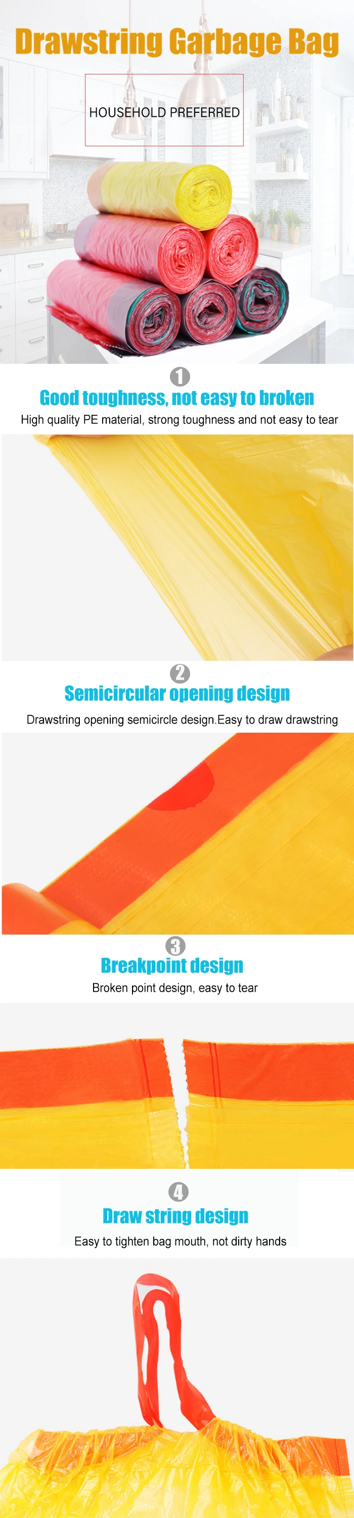 All of our products are made of PE:Garbage bag,trash bags,PE Apron,drawstring bag,nappy bag,